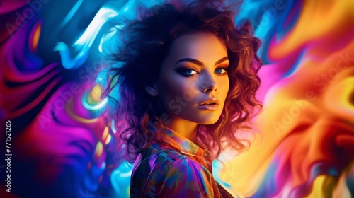 A beautiful woman with curly hair, fresh makeup poses on a colorful neon background. Facial cosmetics, Skin care products, Beauty, Makeup artist, Beauty Studio concepts.