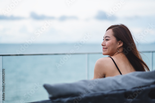 A beautiful young asian woman sitting and looking at the sea and blue sky view