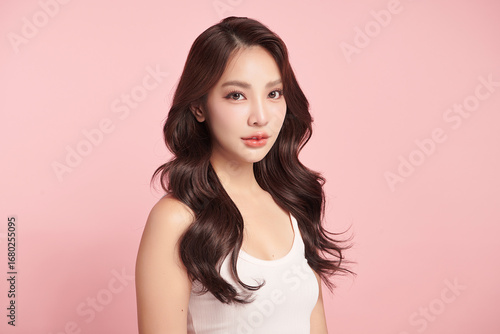 A beautiful young Asian woman with clean, fresh skin against a pink background. Skincare, facial treatment, cosmetology, beauty, and spa. An elegant portrait of an Asian woman.