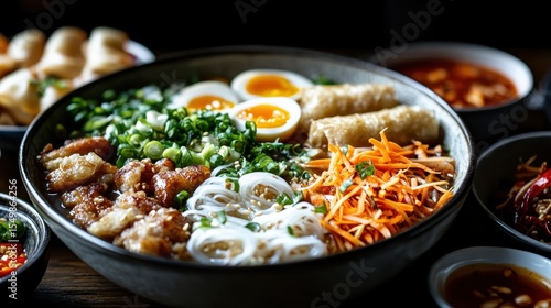 A beautifully arranged bowl of Asian cuisine showcases a variety of ingredients, emphasizing the richness and diversity of flavors in a stunning visual feast for the senses.