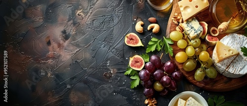 A beautifully arranged cheese platter featuring assorted cheese, fruits, and nuts, perfect for gatherings and celebrations.