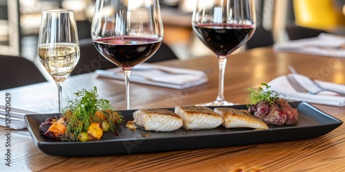 A beautifully arranged platter of pike perch alongside a meat dish, complemented by two glasses of red and white wine, creates an inviting dining experience at the restaurant table.