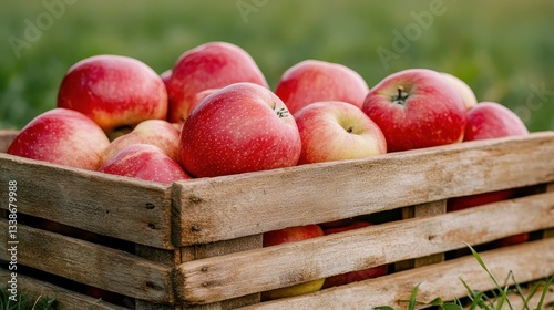A beautifully arranged wooden basket brimming with ripe red apples highlights the joys of harvest and the simple pleasures of fresh produce in natural settings.