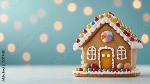 A beautifully decorated gingerbread house, adorned with colorful candies and icing against a soft, blurred blue background, evoking a festive and whimsical feeling.
