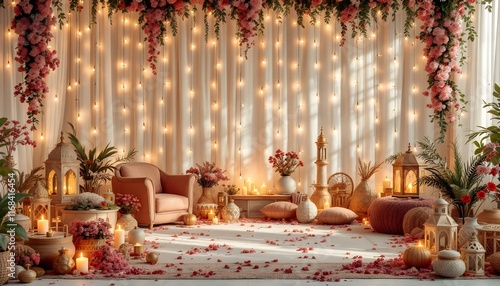 A beautifully decorated room filled with flowers and candles, creating a serene atmosphere for Ramadan celebrations