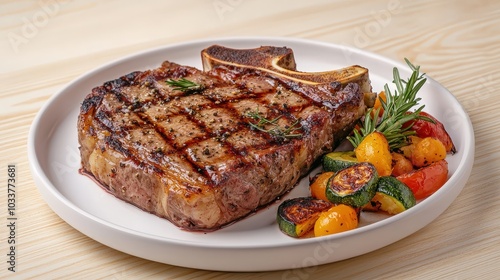 A beautifully grilled steak served with roasted vegetables on a round plate, showcasing a delicious and hearty meal.