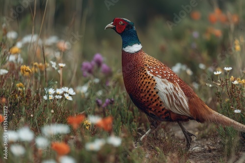 A beautifully plumaged pheasant wanders through a lively meadow filled with diverse wildflowers during a serene late spring evening