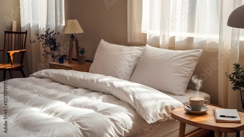 a bed with a book and a cup of coffee on it and a lamp on the side table next to it, Florianne Becker, postminimalism, morning,