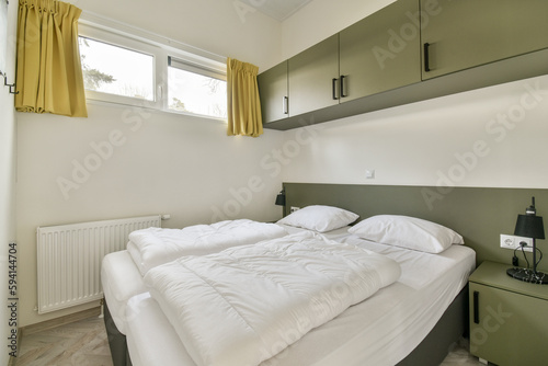 a bed with white sheets and yellow drapes on the headboard is next to a green cabinetd window