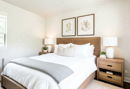 A bedroom with a bed, nightstands and pictures on the wall.