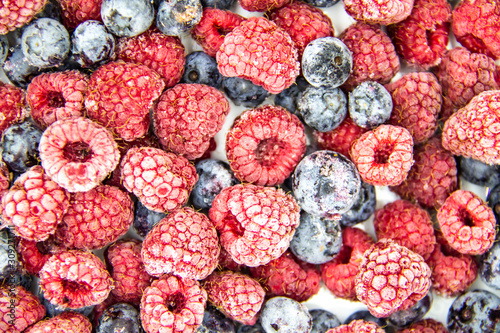 A Berry mix from frozen raspberries and blueberries. A Frozen Berries from freezer. A sweet background with frozen raspberries and blueberries. A heathy Berries in the background.