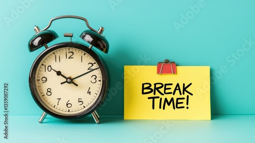 A black alarm clock next to a bright yellow "BREAK TIME!" note against a turquoise background, symbolizing the importance of taking breaks, Mental health in the workplace.