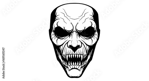 A black and white illustration of a scary monster face with sharp teeth and dark eyes on a white background ai generated