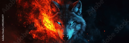 A black backdrop with an image of a blue-eyed wolf with flames surrounding its face in the foreground.
