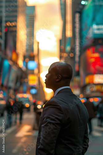A black businessman walking out onto the street