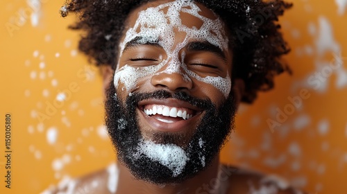 A Black man with a beard smiles as he shaves, demonstrating grooming, self-care, and hygiene