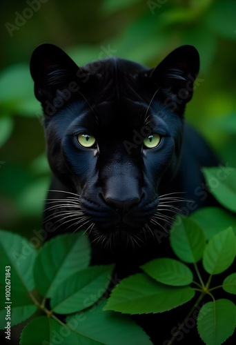 A black panther with green eyes. The panther is looking at the camera. The background is green