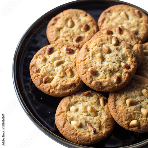 A Black Plate Filled With Golden Brown Peanut Butter Cookies With Visible Peanuts On A Transparent Background With Soft Lighting