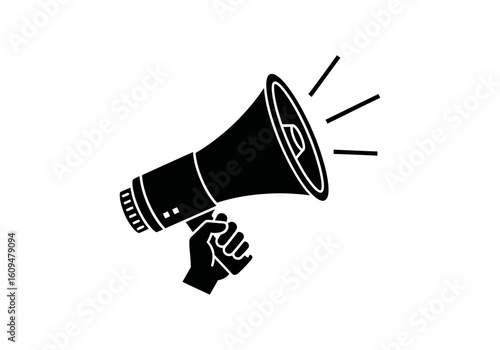 A black silhouette of a hand holding a megaphone, isolated on a white background
