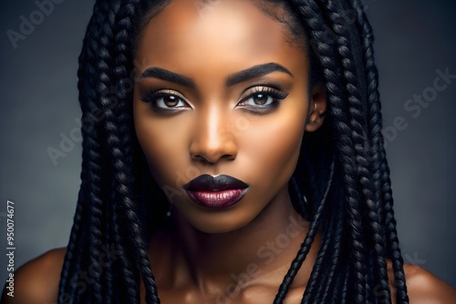 A black woman wears natural and long black braids with lashes and lip gloss