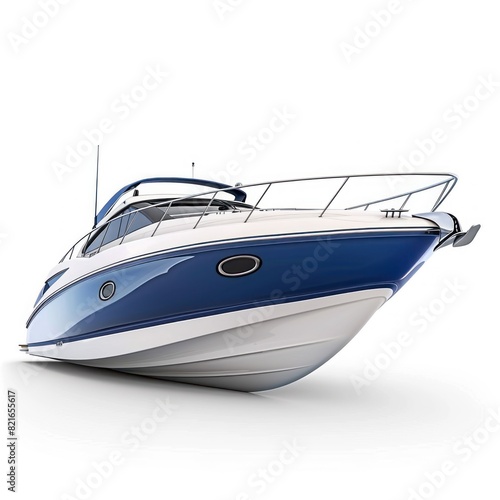 A blue and white boat is parked on a white background