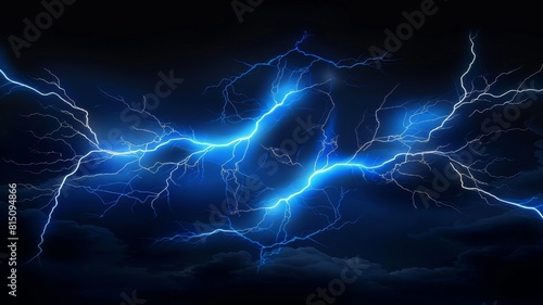 A blue lightning strike depicted on a black background. Looks ultra-realistic thanks to high image resolution. Its vibrant blue color contrasts with the dark background to create a dramatic effect.