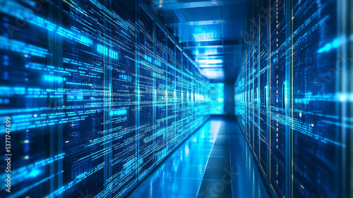 A blue server room with rows of servers and a glowing light at the end of the hallway effect view