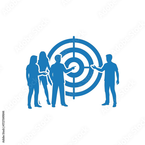 A blue silhouette illustration depicting a team of four people collaborating around a large target symbol, emphasizing focus and shared goals.