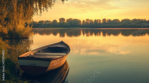 A boat docked along the edge of a calm river at sunset, with soft golden light reflecting off the still water.
