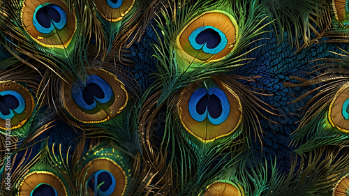 A bold and colorful peacock feather pattern in shades of blue, green, and gold on a plain background, showcasing elegance and vibrancy.