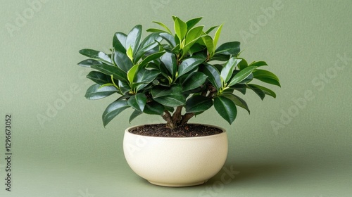 A bonsai-style tea plant in a compact ceramic container on a muted olive-green background