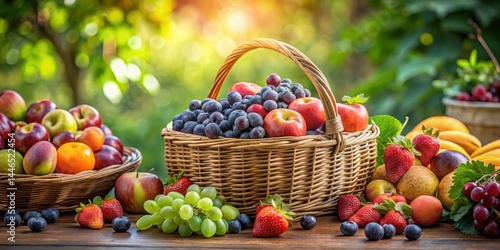 A bountiful summer harvest of ripe, juicy fruits arranged in wicker baskets and scattered on a rustic wooden table, bathed in warm sunlight