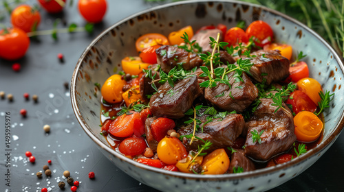 A bowl of beef stew with tomatoes and carrots on a table