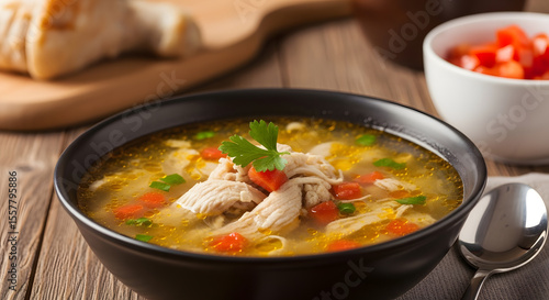 A bowl of chicken soup with vegetables and cilantro garnish, served with bread and diced tomatoes on a wooden table.