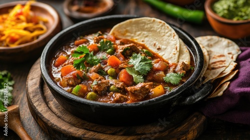 A bowl of chili with a side of tortillas and vegetables. The bowl is on a wooden table with other bowls and utensils