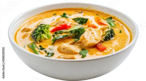 A bowl of creamy coconut curry soup with tender chicken and vegetables, Each spoonful rich and fragrant with spices, Set against an isolated white background to accentuate its exotic aroma