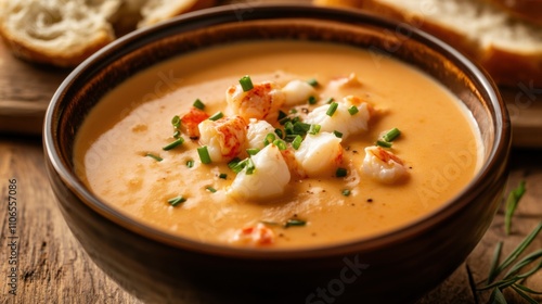 A bowl of creamy lobster bisque garnished with a drizzle of truffle oil and chopped chives, Soup centered, Soft candlelight creating a cozy ambiance