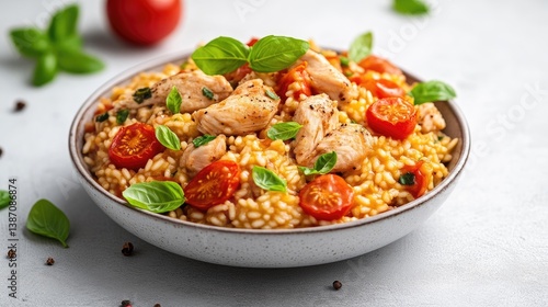 A bowl of creamy risotto features tender chicken pieces and vibrant cherry tomatoes. Fresh basil leaves garnish the dish. The image is well-lit, showcasing high-quality detail. The style is clean an