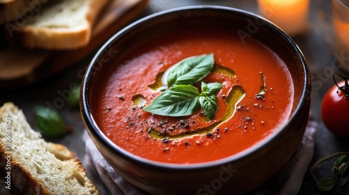 A bowl of creamy tomato basil soup garnished with a drizzle of olive oil and fresh basil leaves, Tomato basil soup bowl centered, Soft diffused lighting accentuating its rich aroma