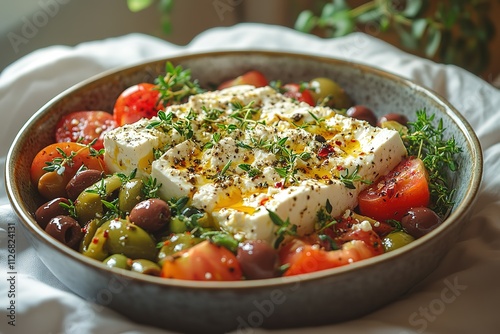 A bowl of food with tomatoes, olives, and cheese
