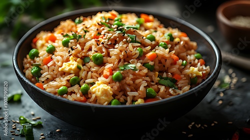 A bowl of freshly made fried rice with peas, carrots, and scrambled eggs.