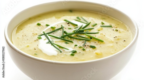 A bowl of hearty potato leek soup garnished with chives and a drizzle of cream, Each spoonful filled with rich and comforting flavors