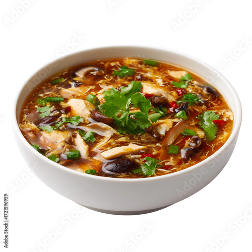 a bowl of hot and sour soup, white background, top view, high-resolution photography, realistic, high-definition quality.