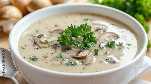 A bowl of mushroom soup: Describe the creamy texture and earthy flavor of the soup, garnished with fresh parsley.