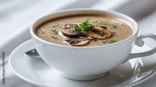 A bowl of mushroom soup is placed on a table with a spoon beside it. The soup has sliced mushrooms and green herbs on top. It is lunchtime and the setting looks inviting.