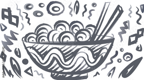 A bowl of noodles with chopsticks surrounded by abstract shapes in black and white sketch style