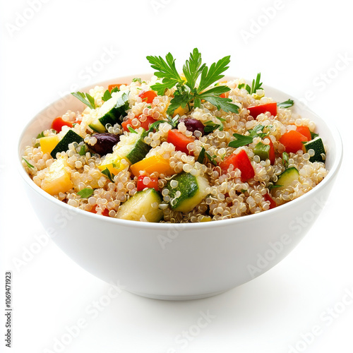 A bowl of quinoa salad with vegetables, isolated on a white background, showcasing a healthy grain-based dish