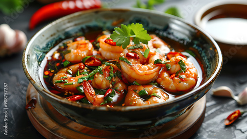 A bowl of spicy prawn curry garnished with fresh herbs.