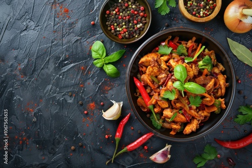 A bowl of Sri Lankan chicken kottu with vegetables and spices, copy space for text