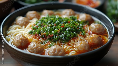 A bowl of steaming hot noodle soup with meatballs, chili oil, and green onions.